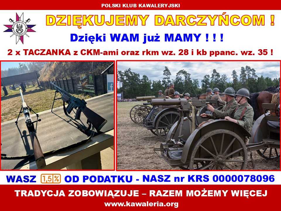 Polski Klub Kawaleryjski jest patriotycznym, dobrowolnym, niepolitycznym, samorządnym i trwałym stowarzyszeniem niezarobkowym osób fizycznych, których celem jest kultywowanie i kontynuowanie tradycji kawalerii i jazdy polskiej. Więcej...